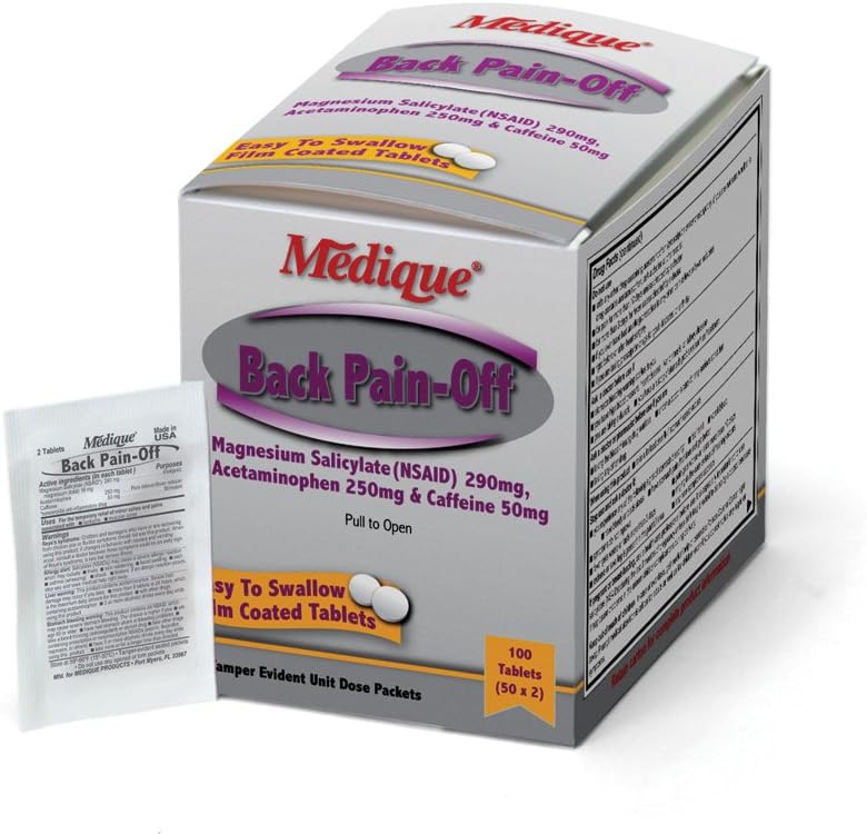 Medique Mediproxen Naproxen Pain Reliever Tablets 100/box ... from i.ebayimg.com These can be done at home as often as you need to. This pain reliever contains magnesium salicylate, caffeine, and acetaminophen which can provide you with instant relief from the pain. Medique maximum strength back pain relief contains the maximum dosage allowed for temporary relief of back pain, muscular aches, strains and inflamed joints of the lumbar and sacral regions.